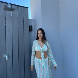 Set tonos beige/ verde/ celeste – De pareo largo y blusa con lazos
