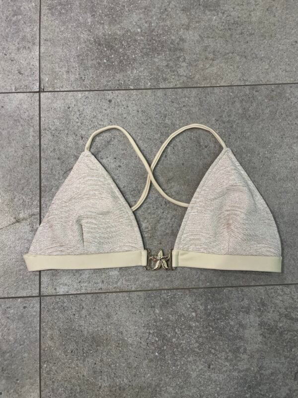 Corpiño lycra blanca con hilos dorados, herrajes dorados