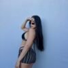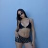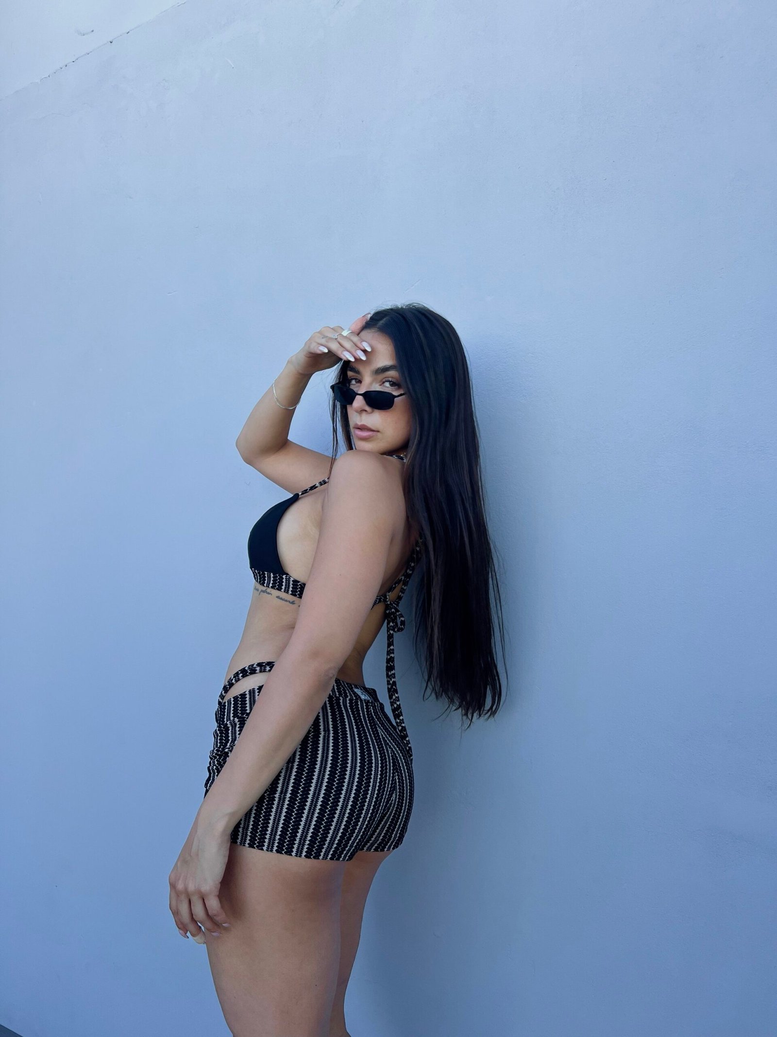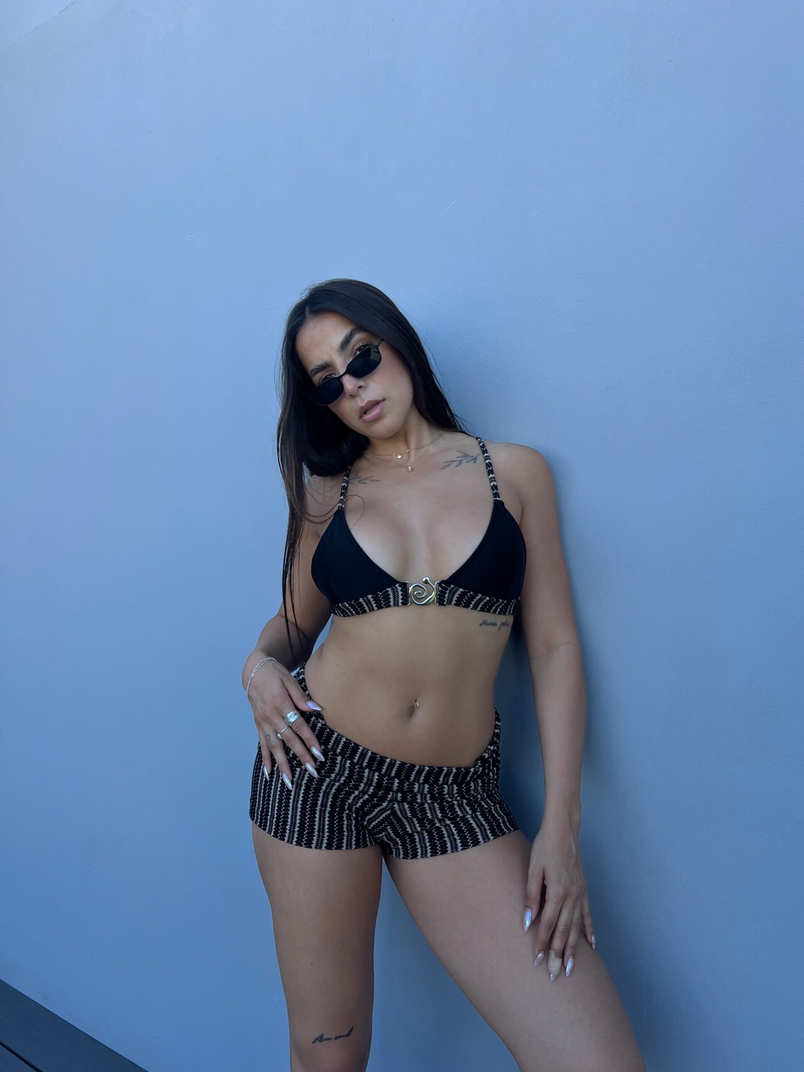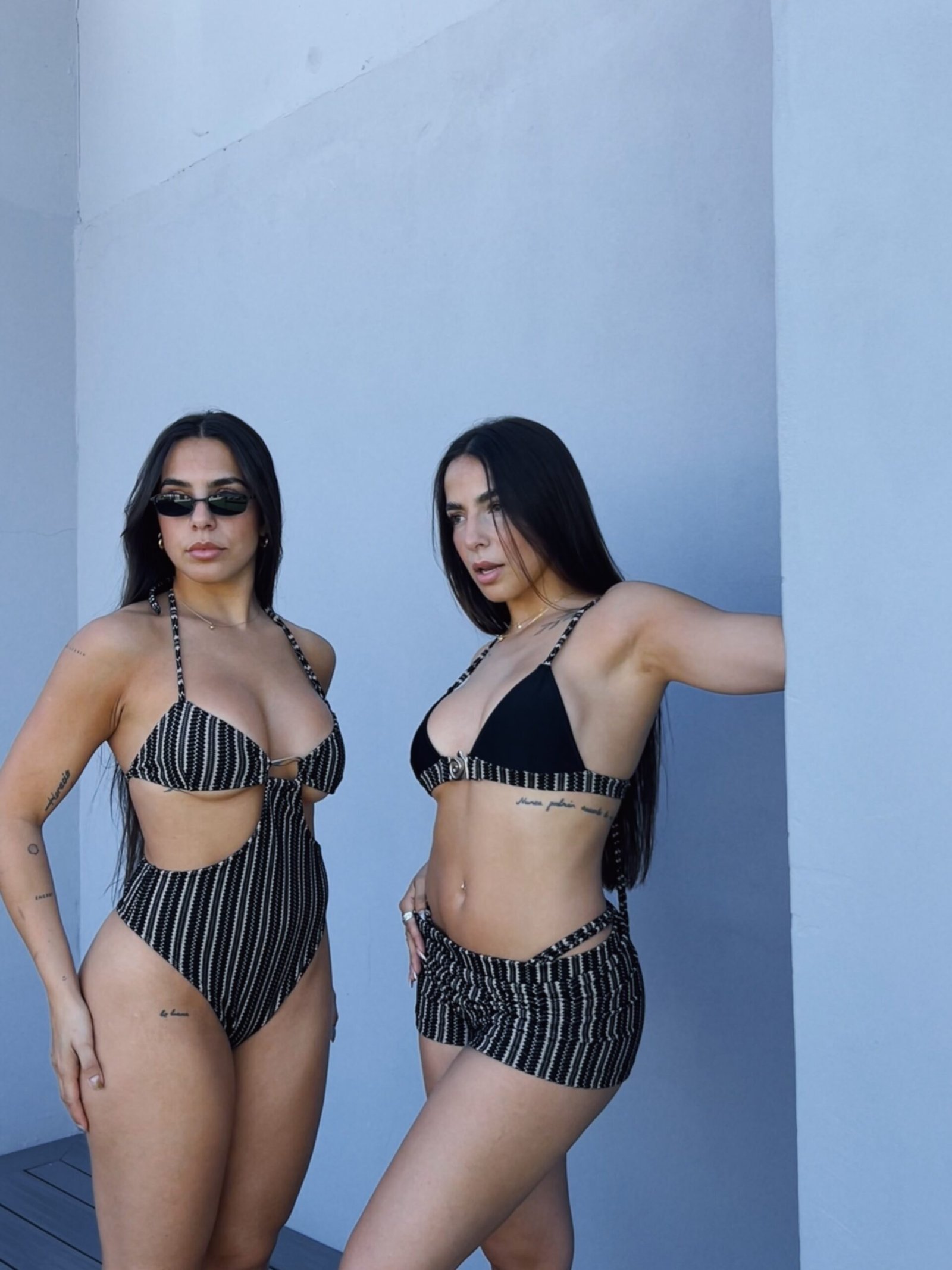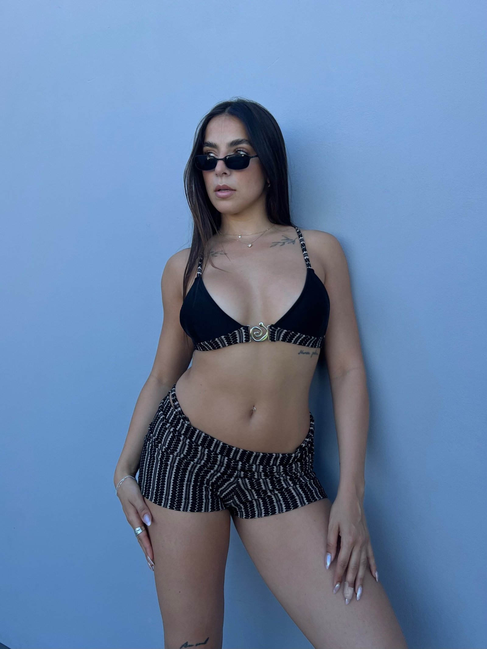 Bikini combinada lycra lisa con lycra con textura tipo crochet ( importada de Brasil ). Corpiño con elástico en el bajo busto, herraje de Zamak, las tiras se regulan. Con bombacha negra con tiras texturadas regulables. El short se vende aparte