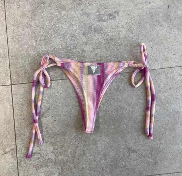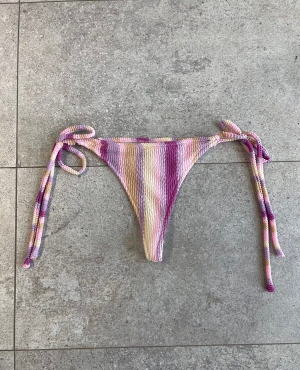 Confeccionada en tejido macramé rayado, tonos lila/violeta/rosa con tiras para atar en laterales