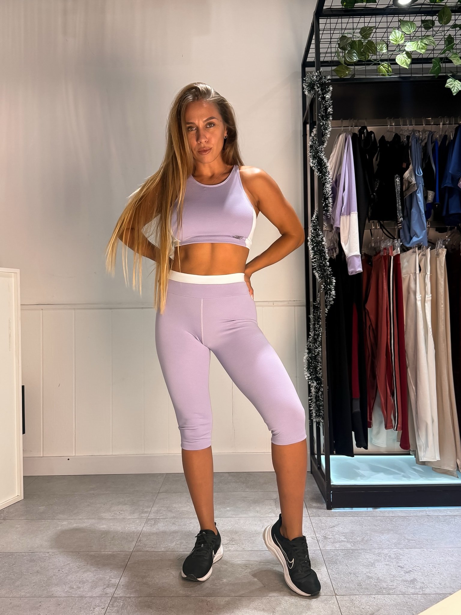 Calza capri lila con blanco