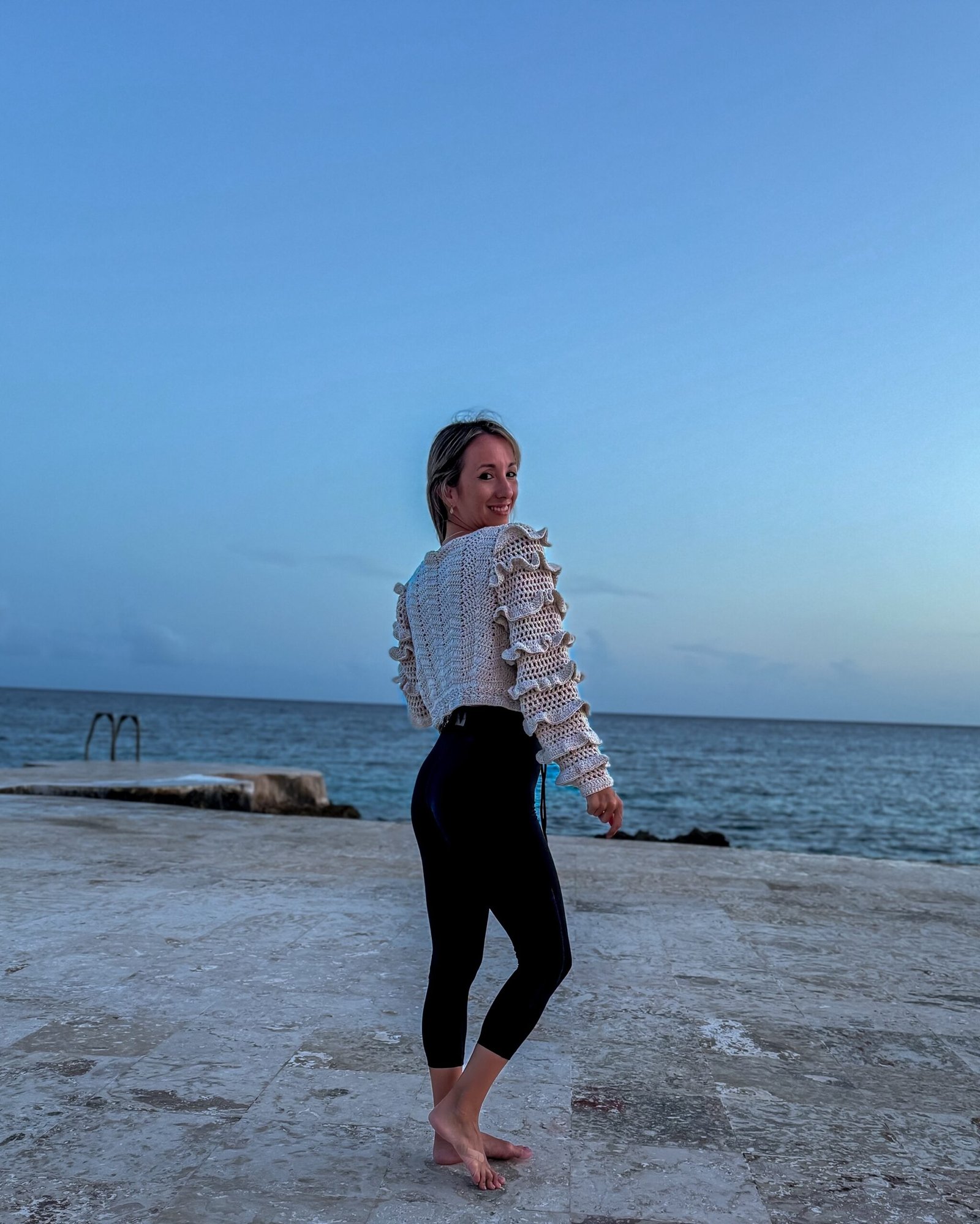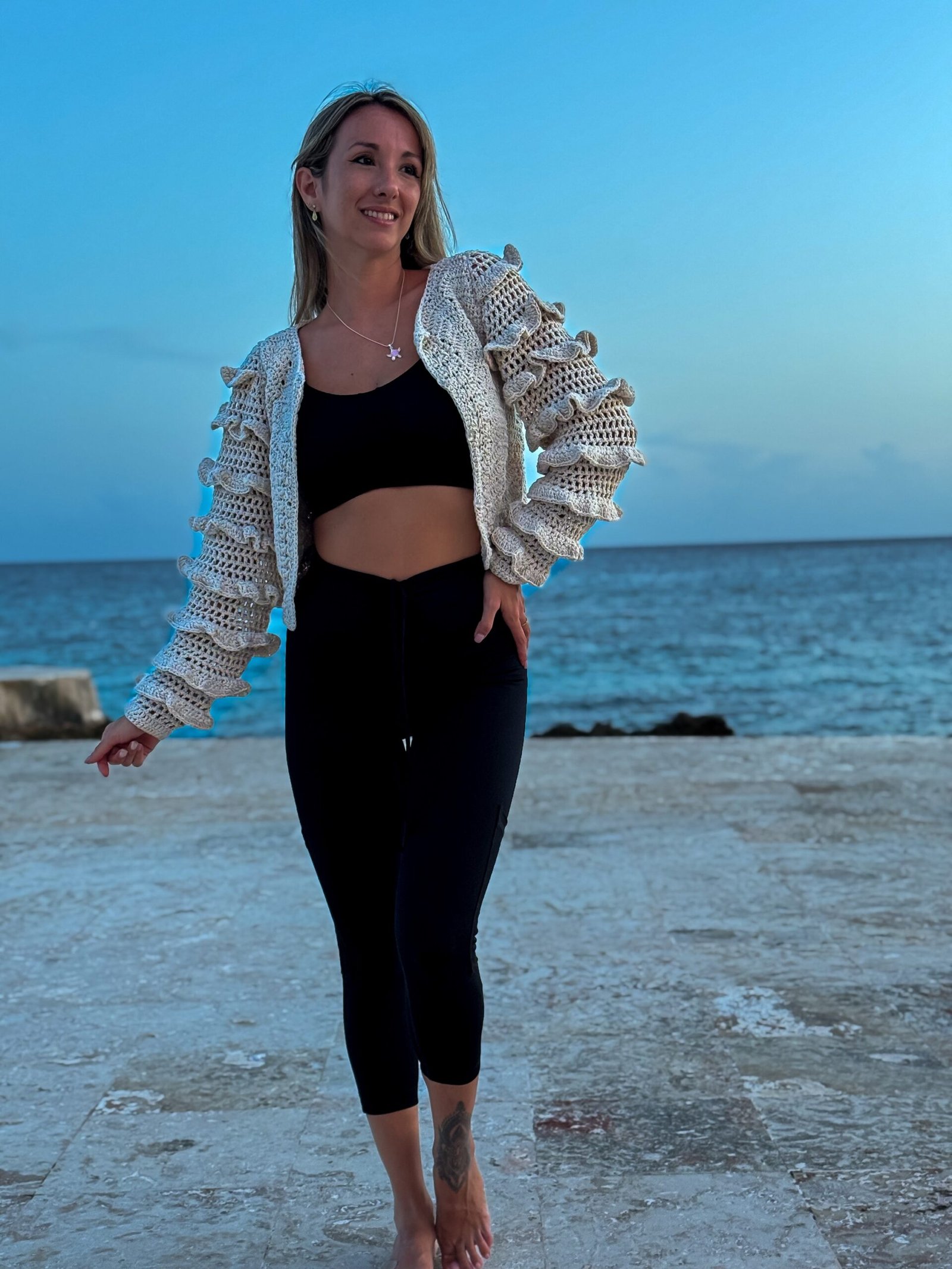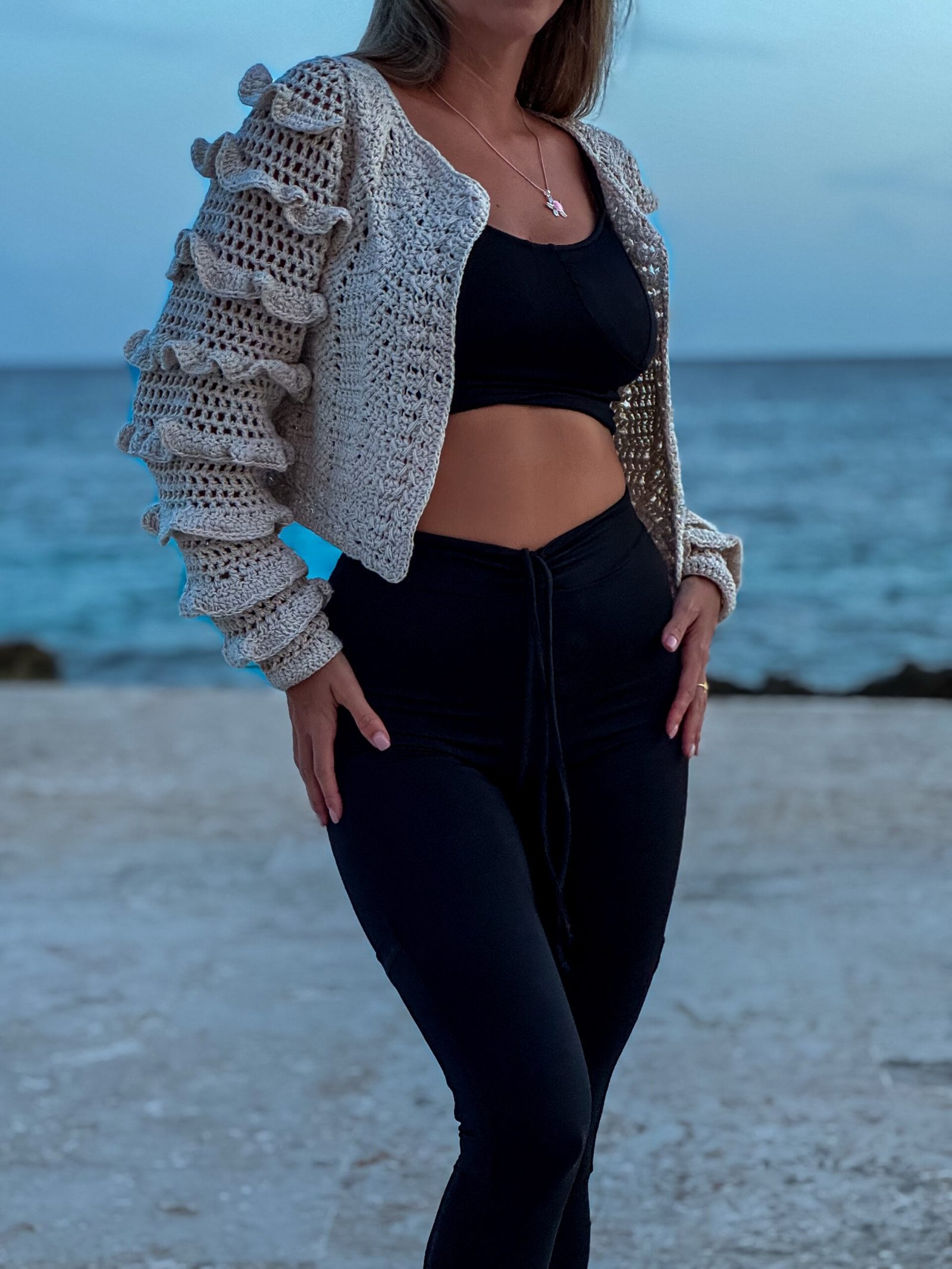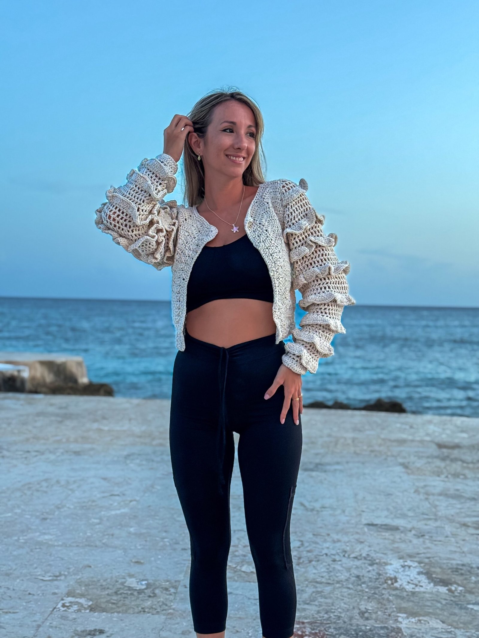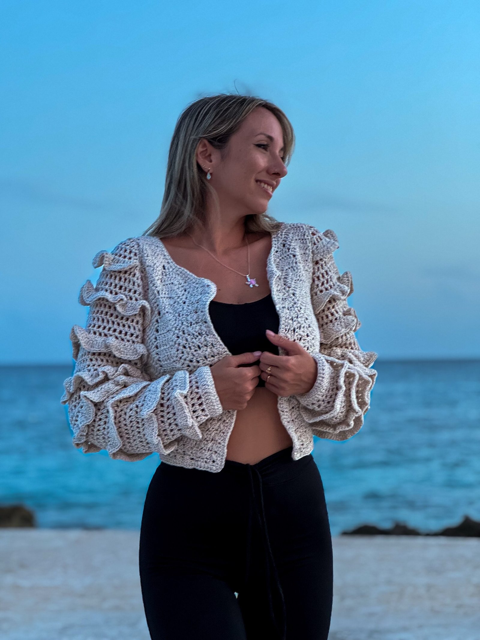 Cardigan tejido crochet con mangas con volados