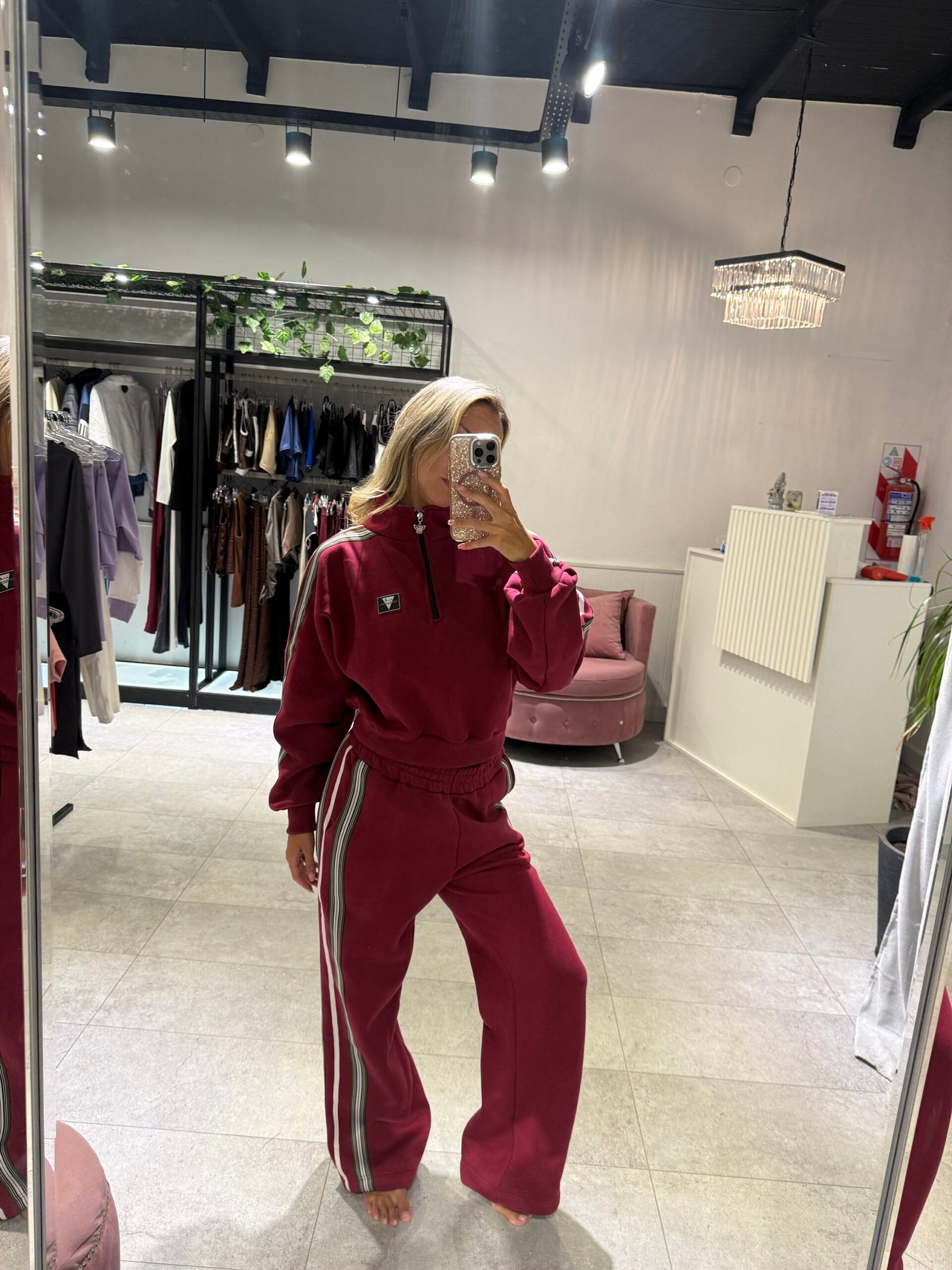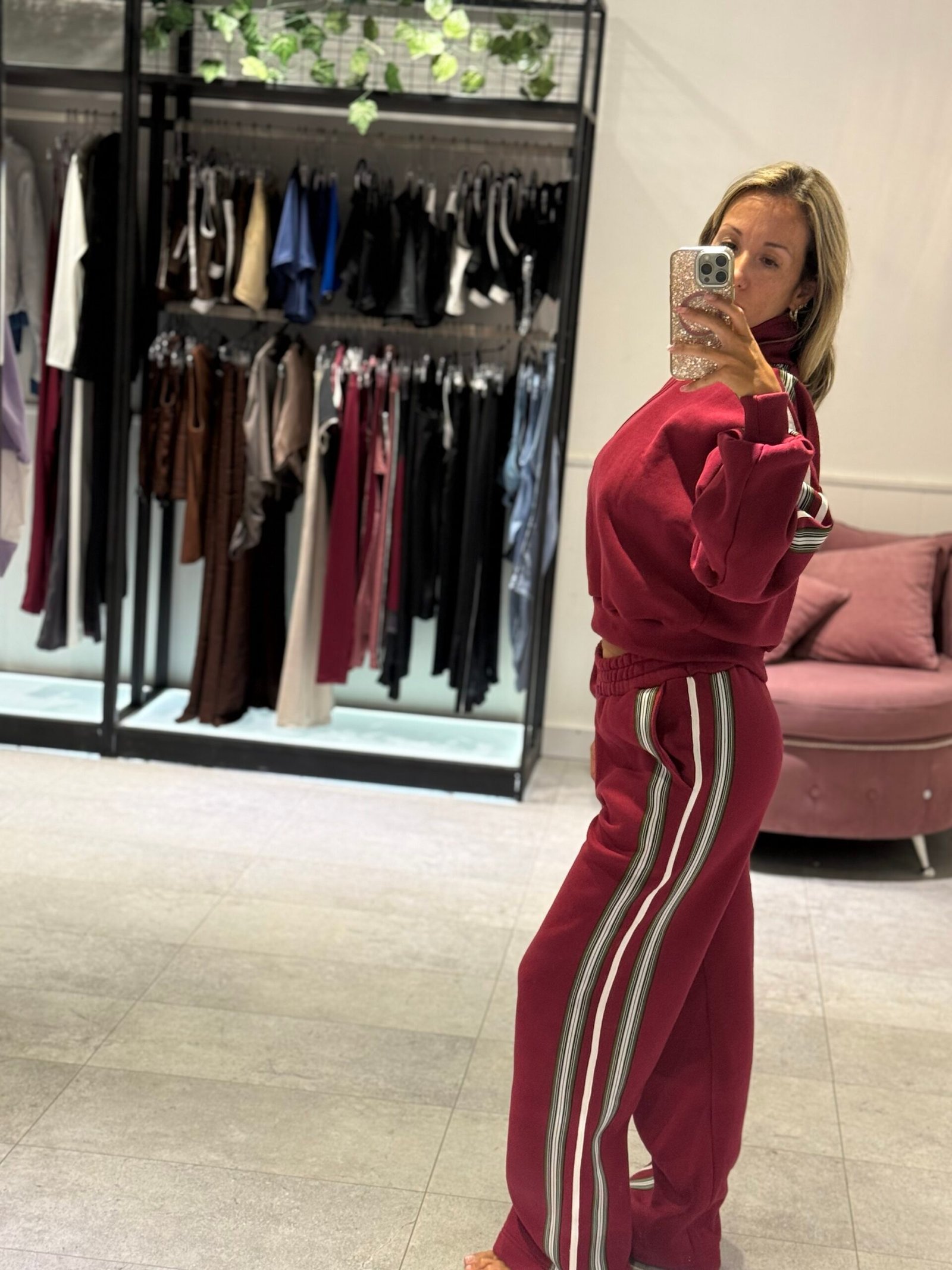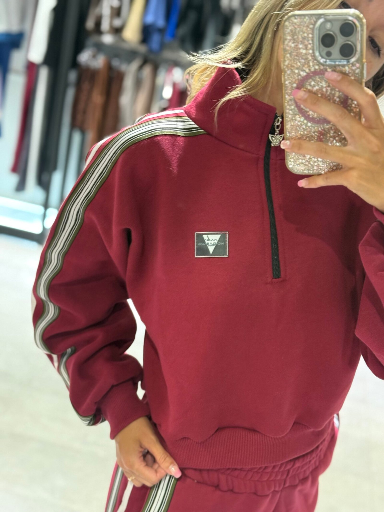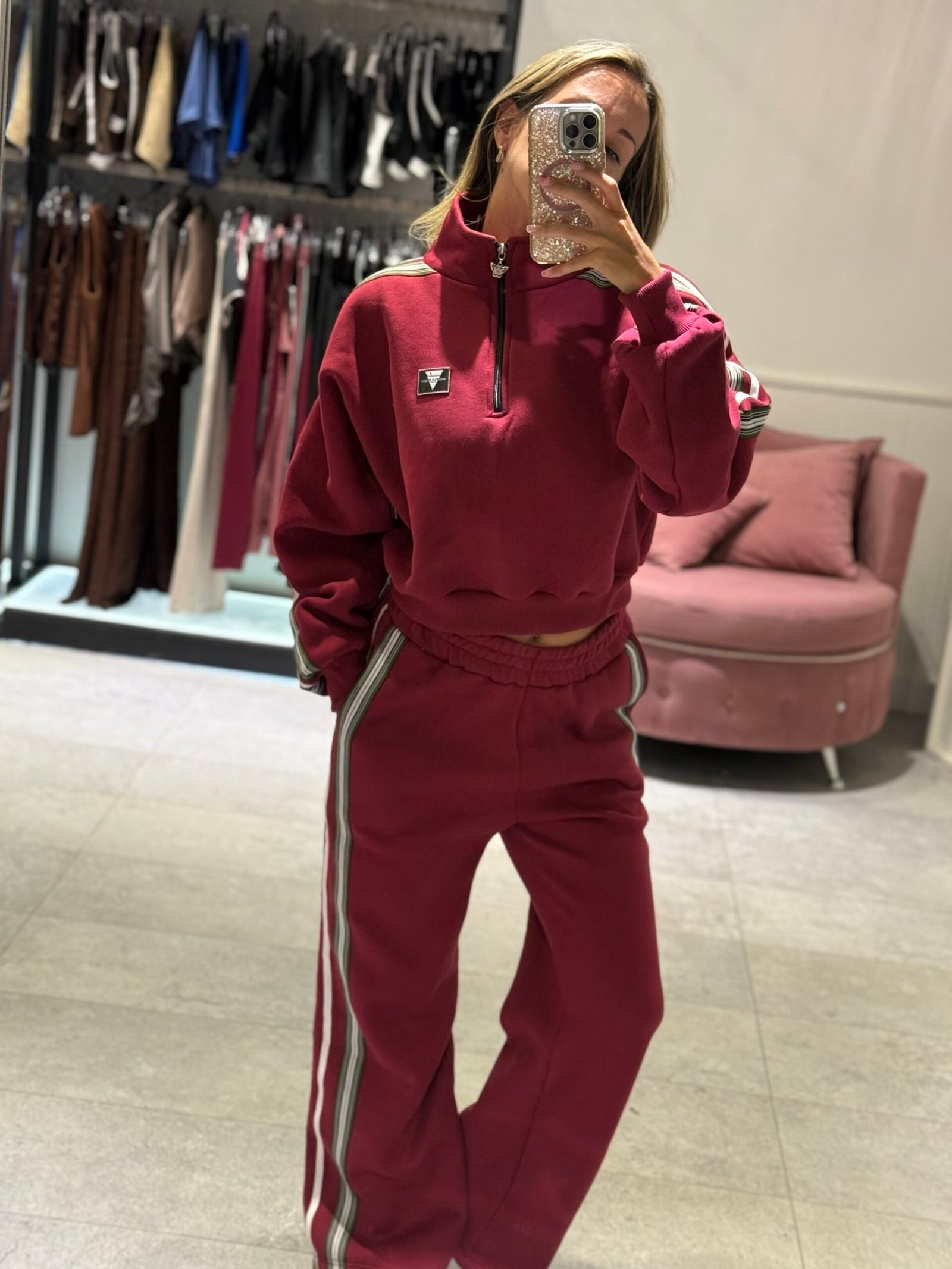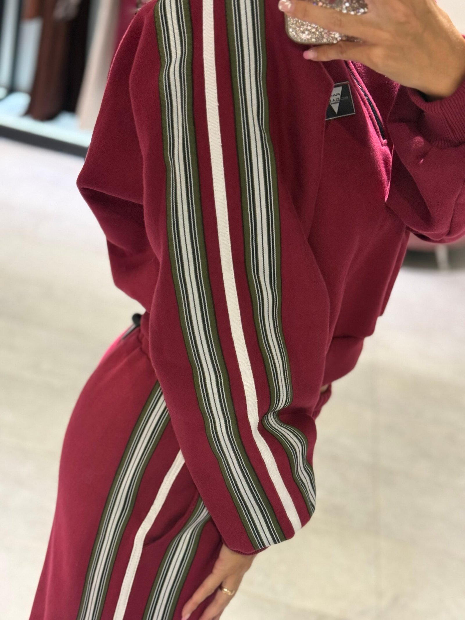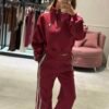 Set bordo con detalle en laterales de Mangas y pantalón. Con frisa – buzo + jogger TL