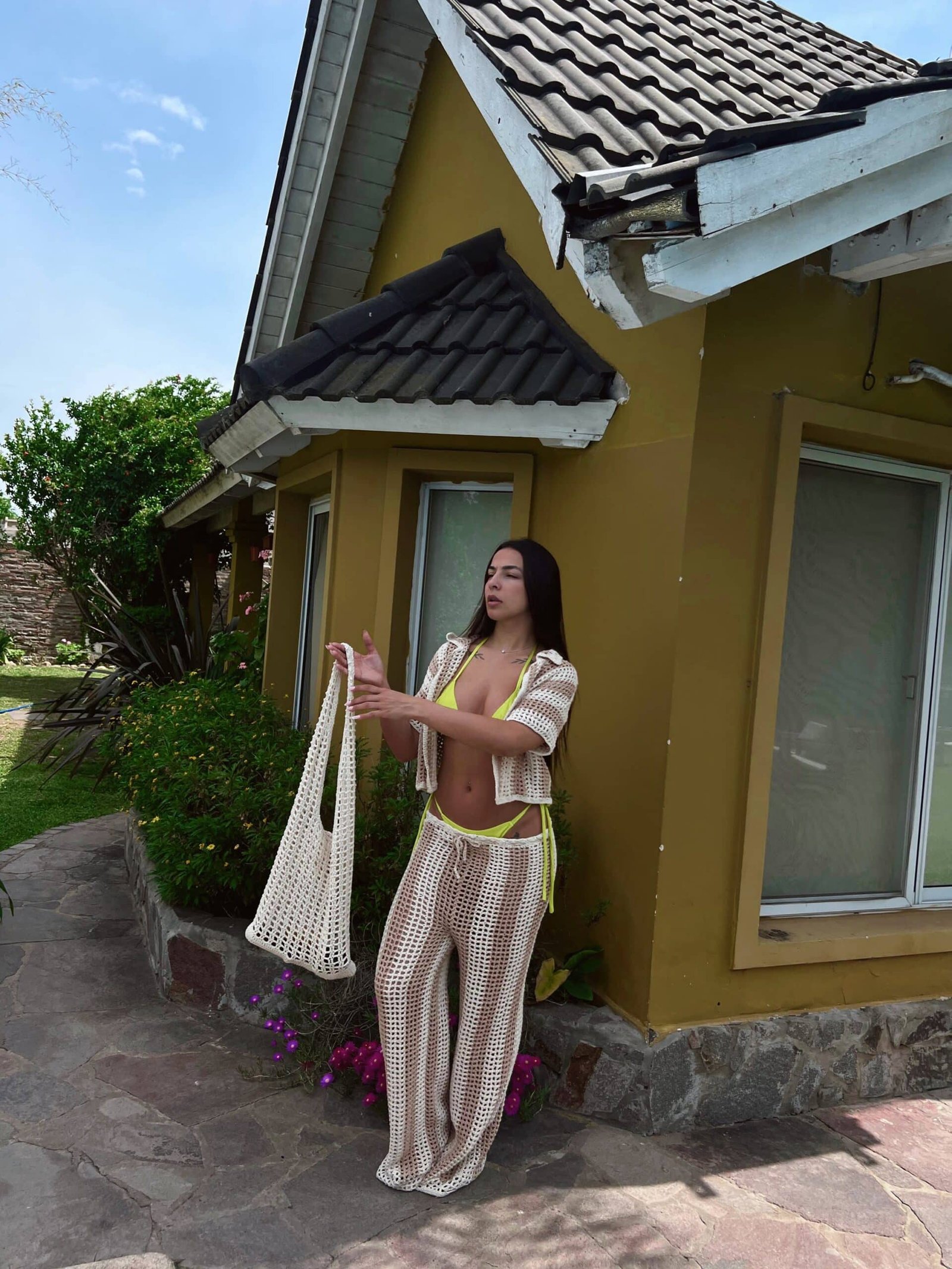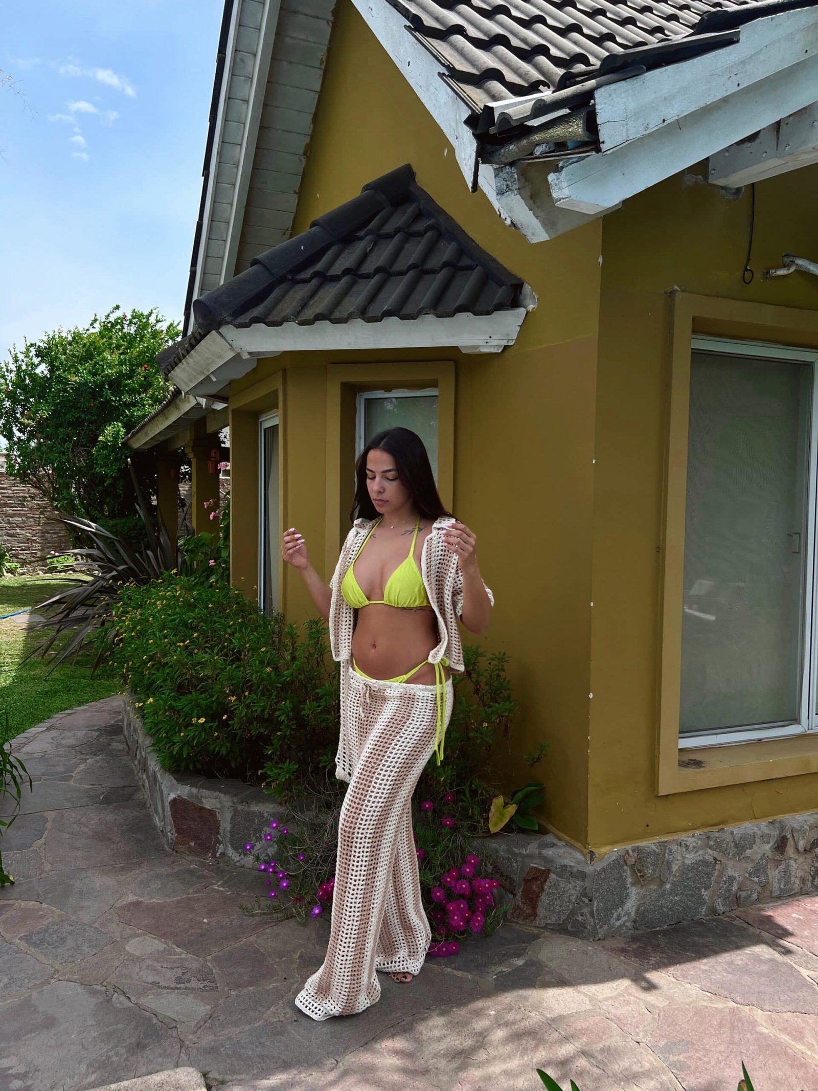 Set tejido crochet rayado beige y crudo