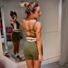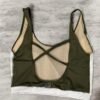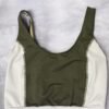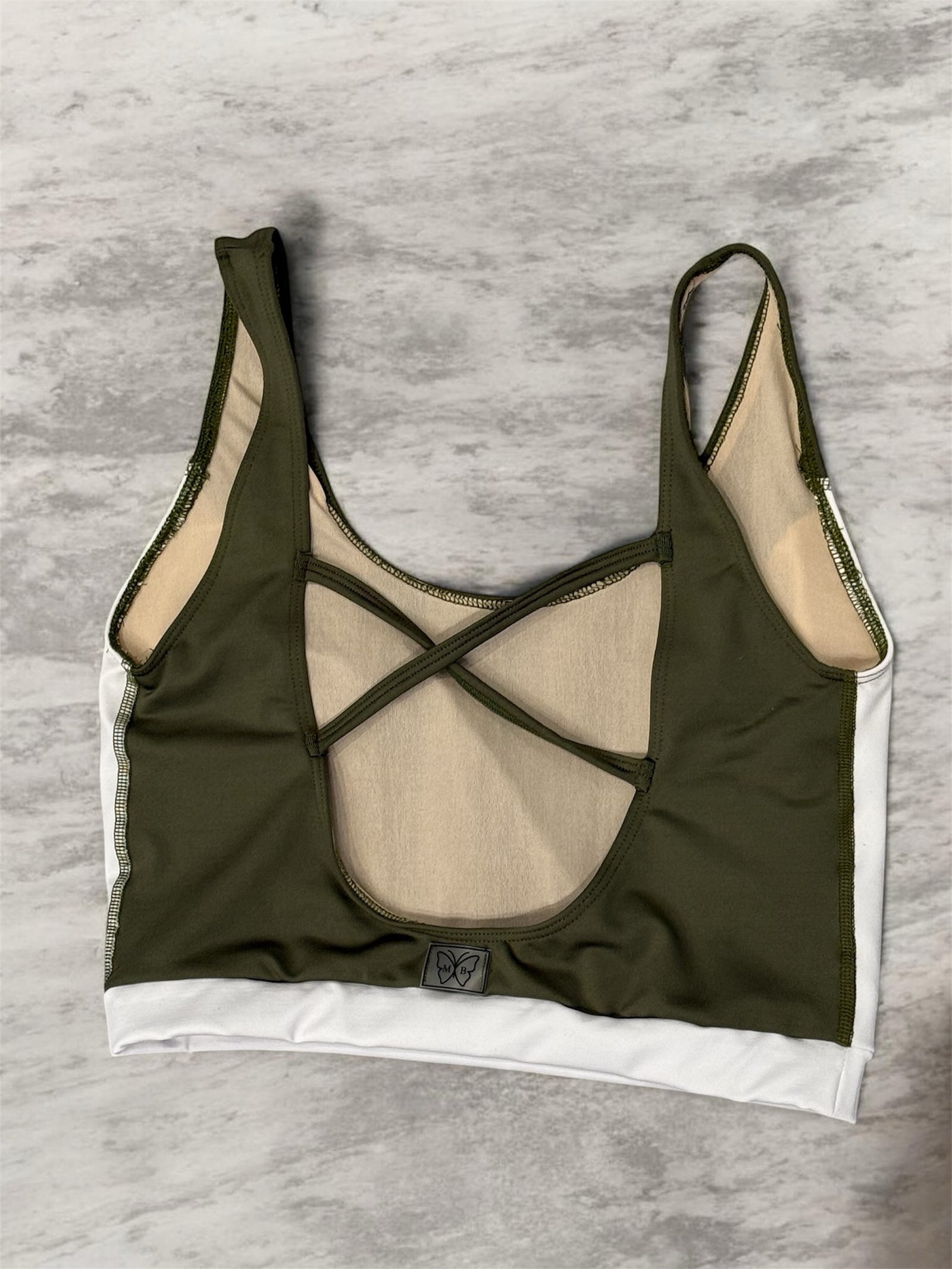 Top verde oliva con recortes blancos, cintura con elástico y espalda baja con tiras cruzadas
