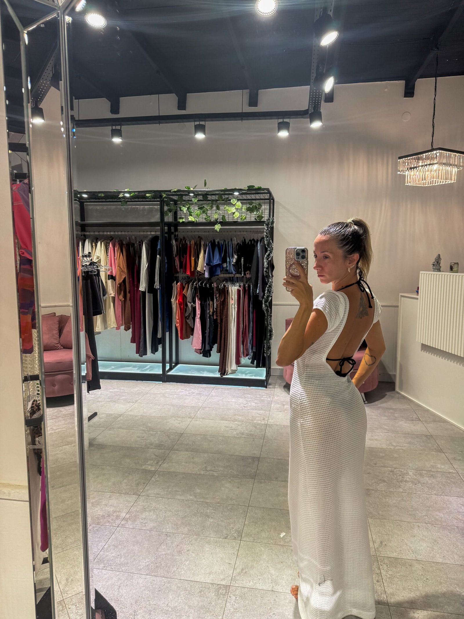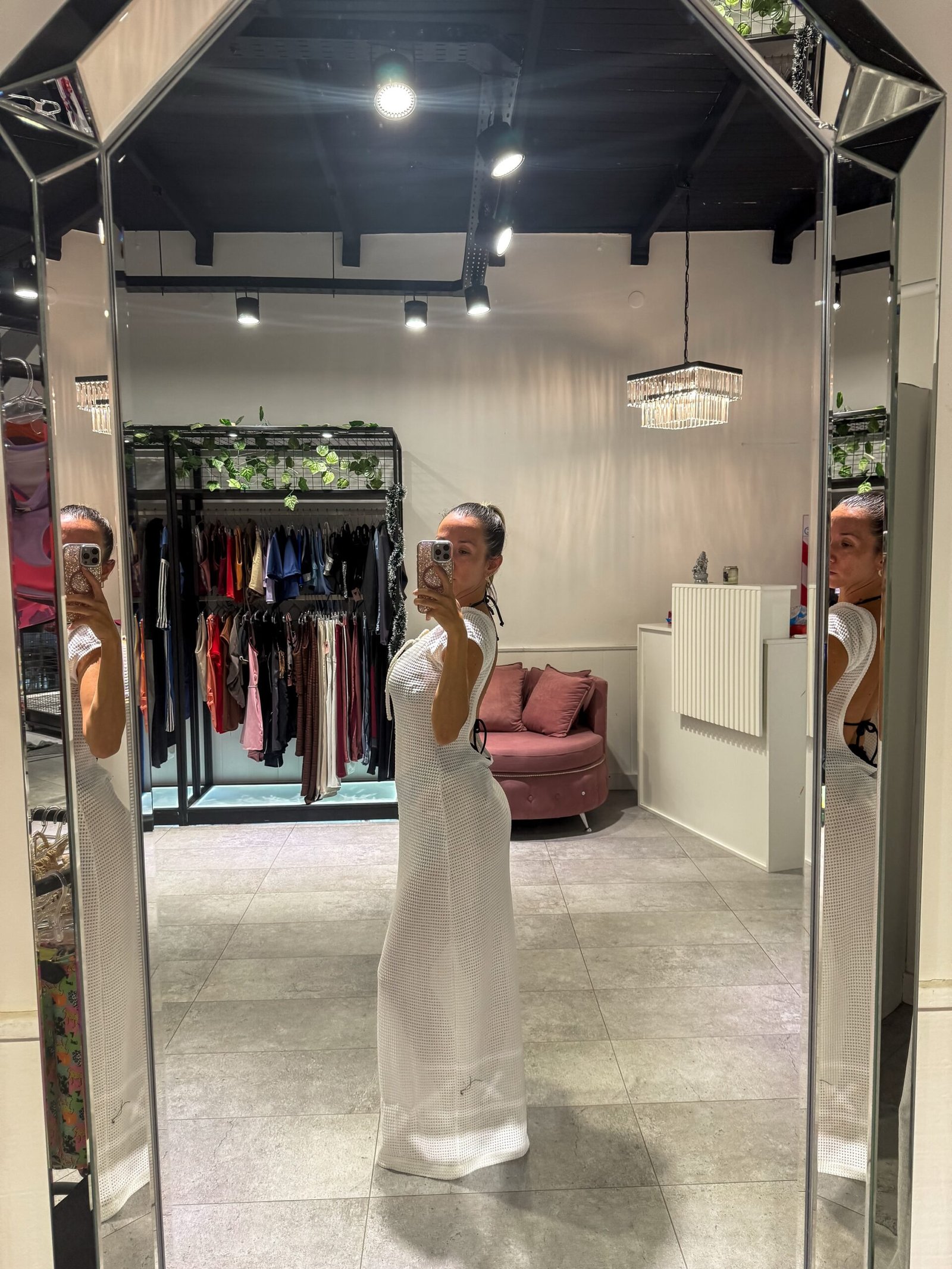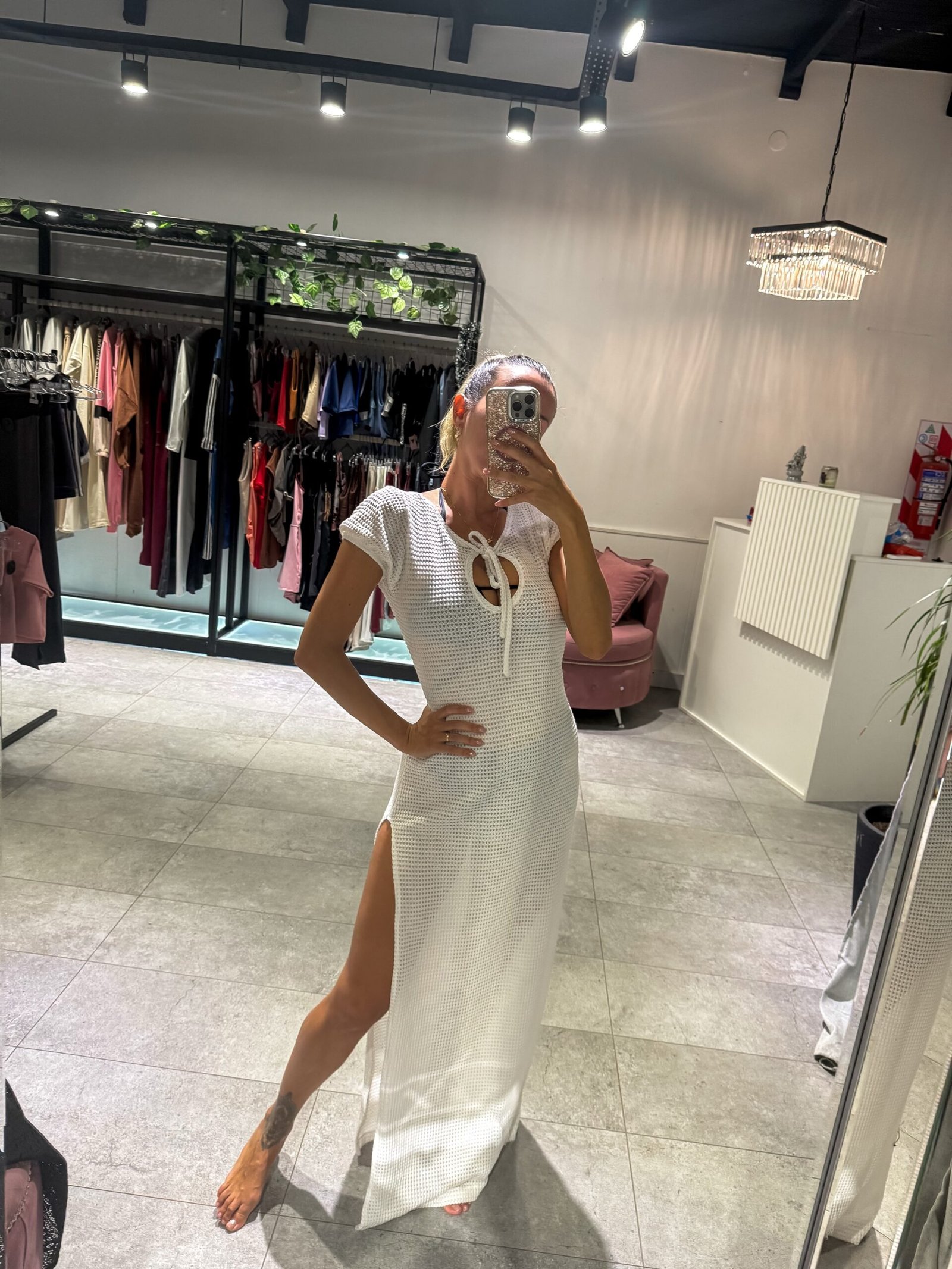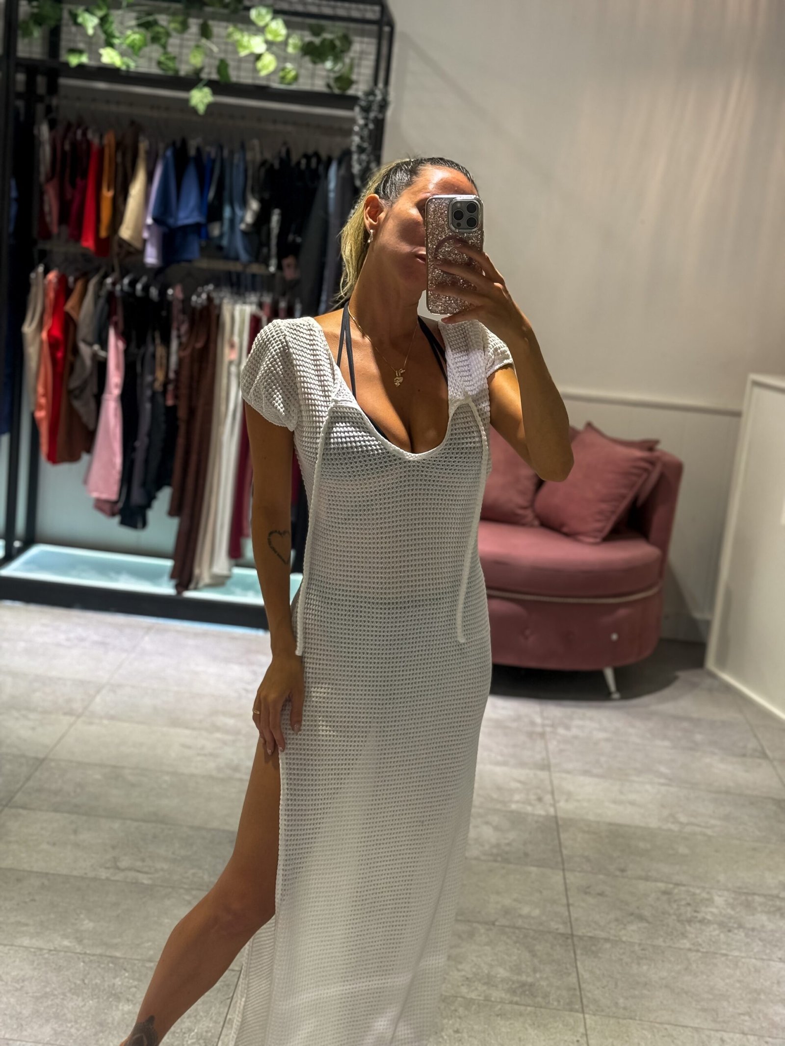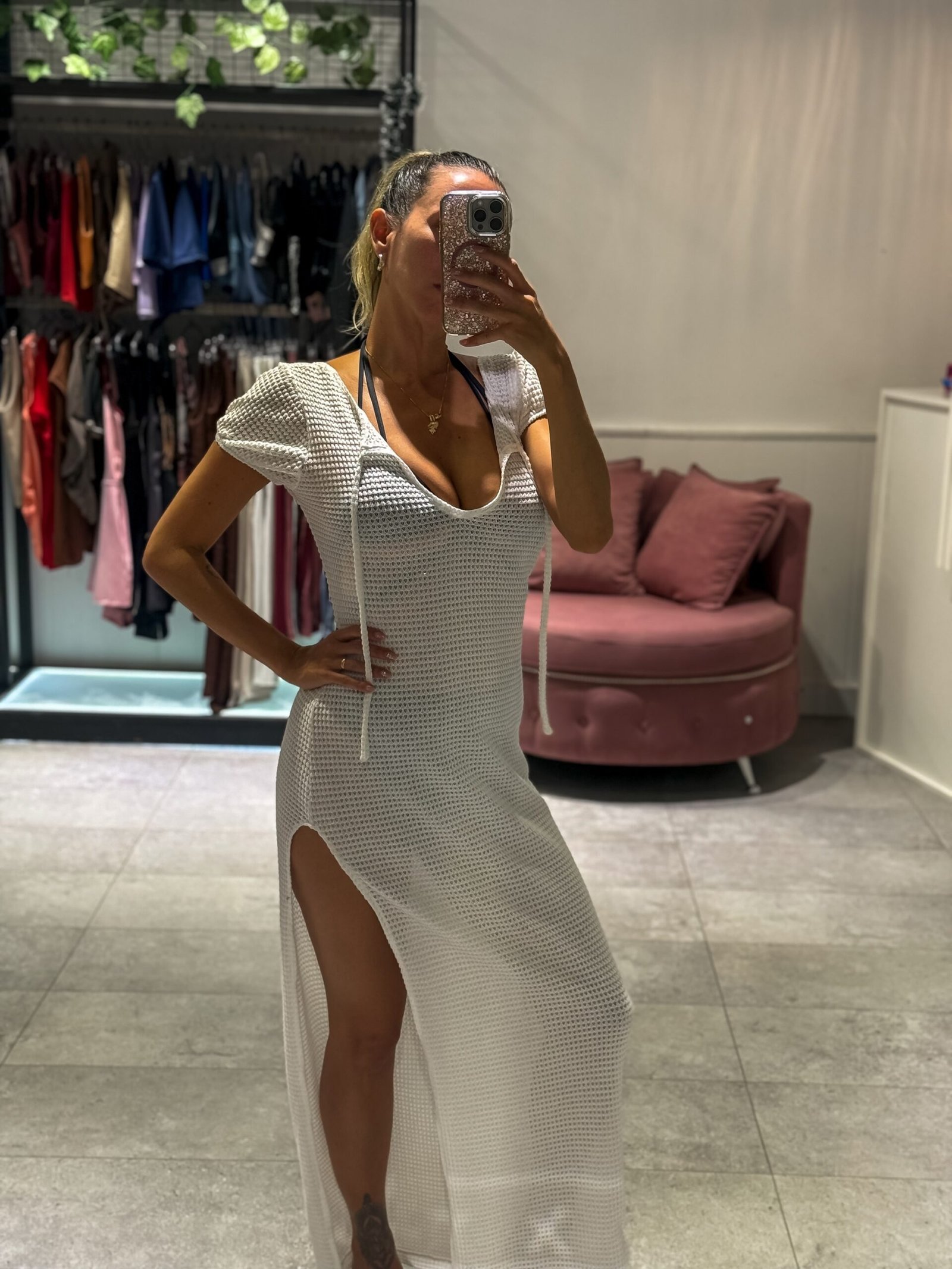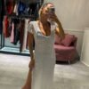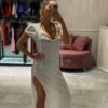 Vestido blanco largo con tajo lateral, mangas cortas, espalda descubierta ( tela calada importada )