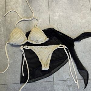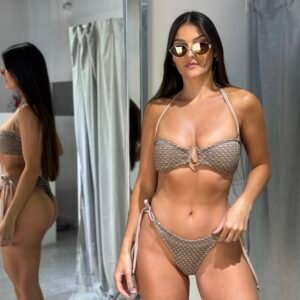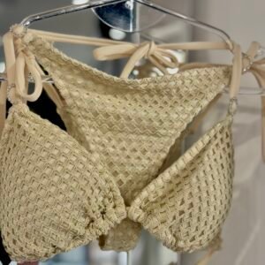 Bikini tipo tejida crudo, corpi triángulo, Less para atar. Con argollitas de strasses