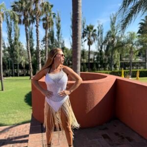 Vestido tejido crochet con flecos ( blanco con champagne )